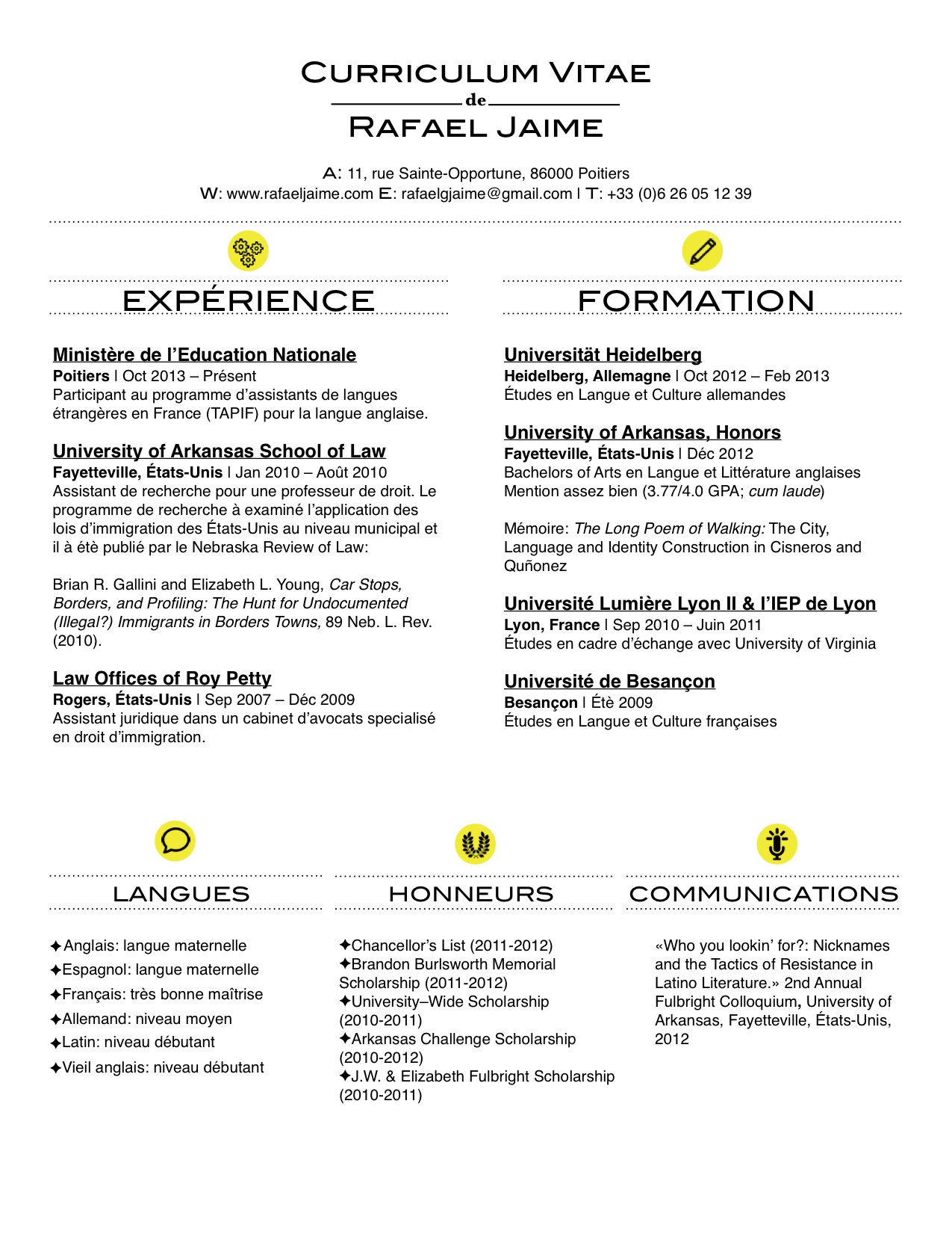 Diplômé de Lettres Modernes à University of Arkansas, j’ai participé à un échange à l’Université Lumière Lyon II et à l’IEP de Lyon où mon programme comprenait des cours en littérature française et en histoire politique. Vivement intéressé par la problématique d’identité américaine, j’ai écrit mon mémoire (pour lequel j’ai obtenu la mention bien) sur la formation d’identités à travers les représentations de l’espace dans la littérature des latinos aux États-Unis.